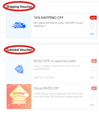 Vouchers can be found in the “Voucher Center”, where they are divided into two categories: Subtotal and Shipping. Shipping vouchers apply discounts to shipping fees, while Subtotal vouchers reduce the total payment amount. Each voucher has its own terms and conditions, which users can view by clicking on the “T&C” link.